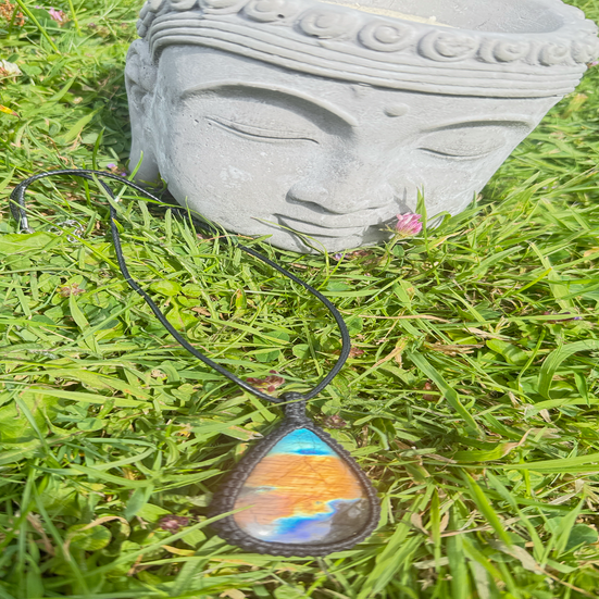 A flashy iridescent labradorite polished stone wrapped in a sturdy black cotton thread.